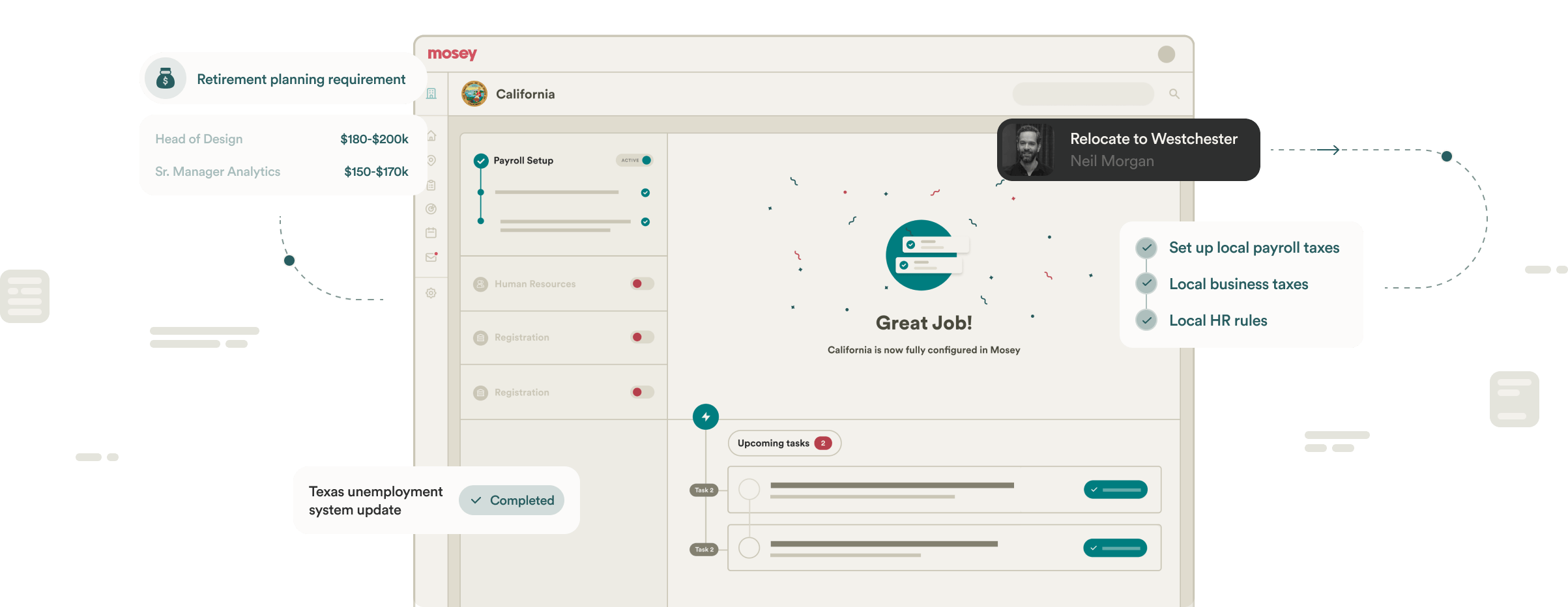 Employees in a new location create ongoing compliance requirements. Mosey automatically detects thousands of requirements so your business can stay compliant.